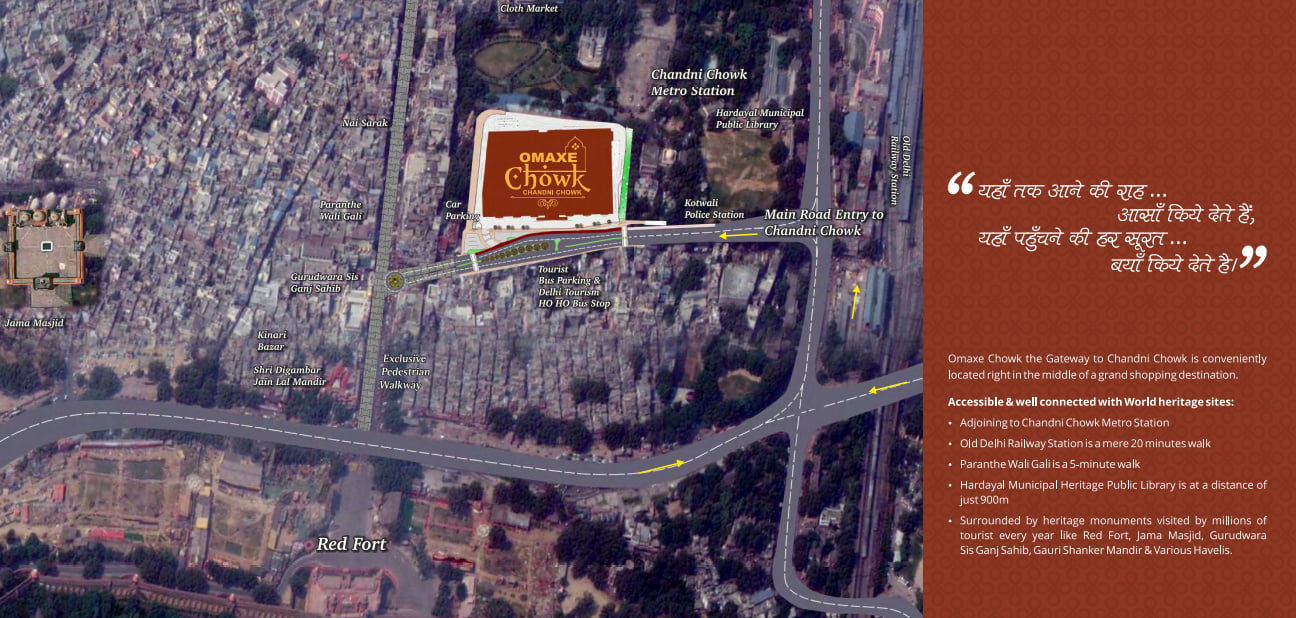 Chandni Chowk is one of Asia’s busiest market for Spices,Dry Fruits,Beautiful conventional Jewellery’s,Ethnic wear,Bridal wear and remarkable taste of assortments of food. Omaxe Chowk venture is extremely close to world’s well known landmarks like Red Fort and Jama Masjid. .