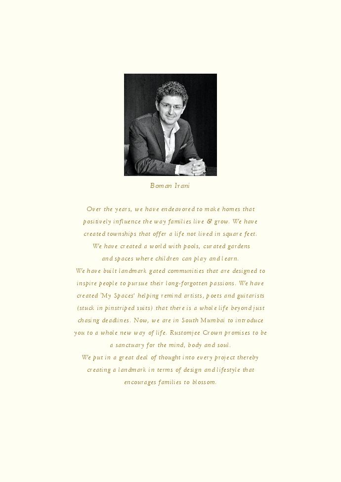Being a pioneer in this field, Rustomjee Developers have been building residential since 1996. The company is headed by Managing Director and Chairman Boman R. Irani. Further accompanied by the Directors Chandresh D. Mehta and Percy S. Chowdhry. Rustomjee plans to complete and develop around 16 million square feet of real estate in addition to generation of INR 14 billion as annual group turnover. Constructed over thirty five properties, eleven of which are under construction for both residential and commercial. Rustomjee developers are known for its strict delivery schedules and quality standardsMost of the projects of Rustomjee developers is located in Juhu and Thane West. The is certified as an ISO: 9001: 2008 Company.