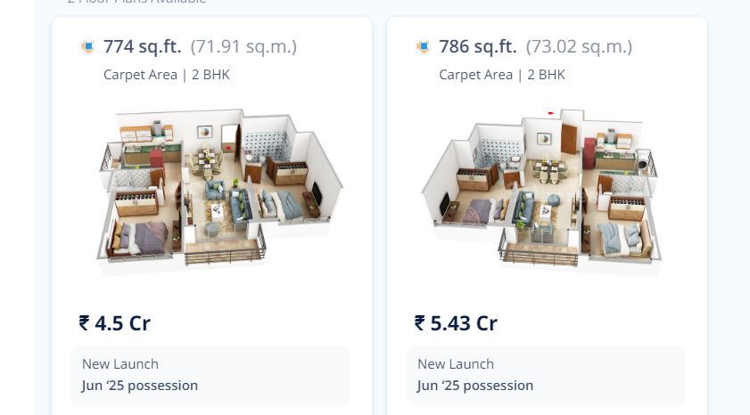 • Carpet Area: Ranges from 774 sq.ft. to 786 sq.ft. (71.91 sq.m. to 73.02 sq.m.)